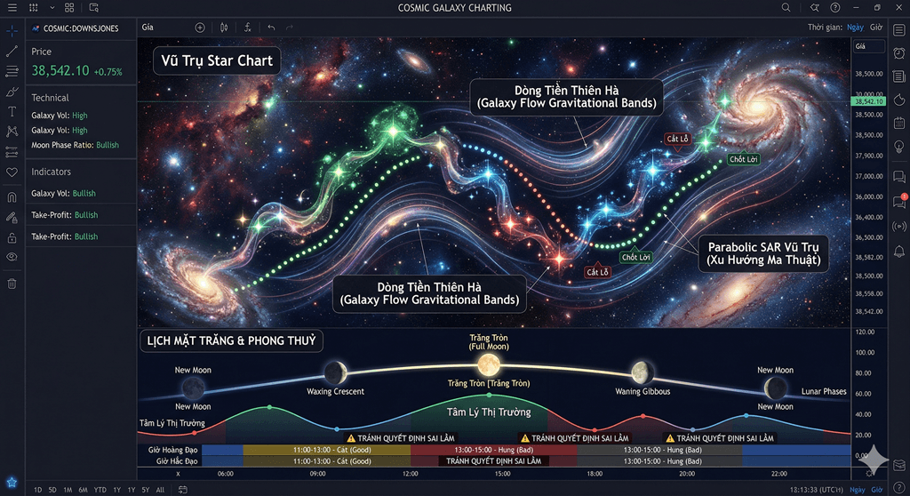 Hệ thống biểu đồ phân tích chuyên sâu VN30F1M phiên bản Chart Vũ Trụ. Kết tinh sức mạnh từ Lịch Mặt Trăng, Phong Thuỷ Á Đông và sự tối ưu xu hướng của Chỉ báo Parabolic SAR.