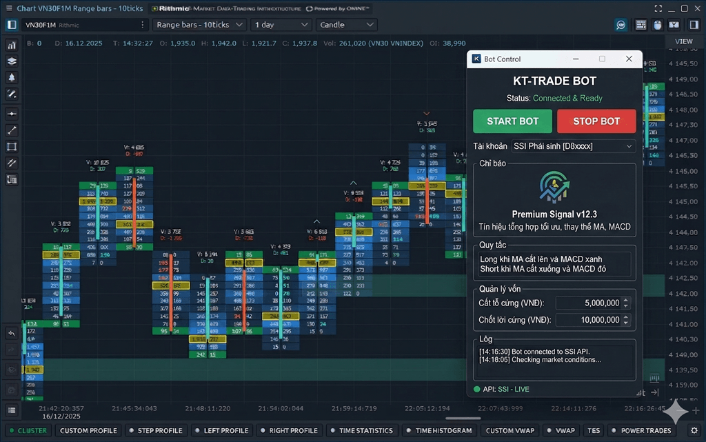 Đẩy lệnh thẳng qua API Broker SSI & VCI không độ trễ. Cơ chế quản lý rủi ro: cutloss cứng, EOD auto-close, chống nhiễu 2 chiều.